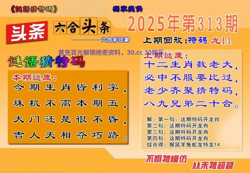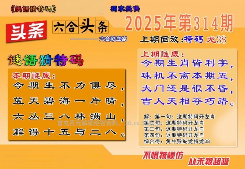 | 313期 今期生肖皆利字 珠机不商本期五 大门还是很不昏 吉人天相夺巧路 解译:大门还是很不昏指大肖牛马羊狗虎猪,吉人天相夺巧路指天肖兔牛猪猴马龙 九肖:牛马羊狗虎猪兔龙猴 |